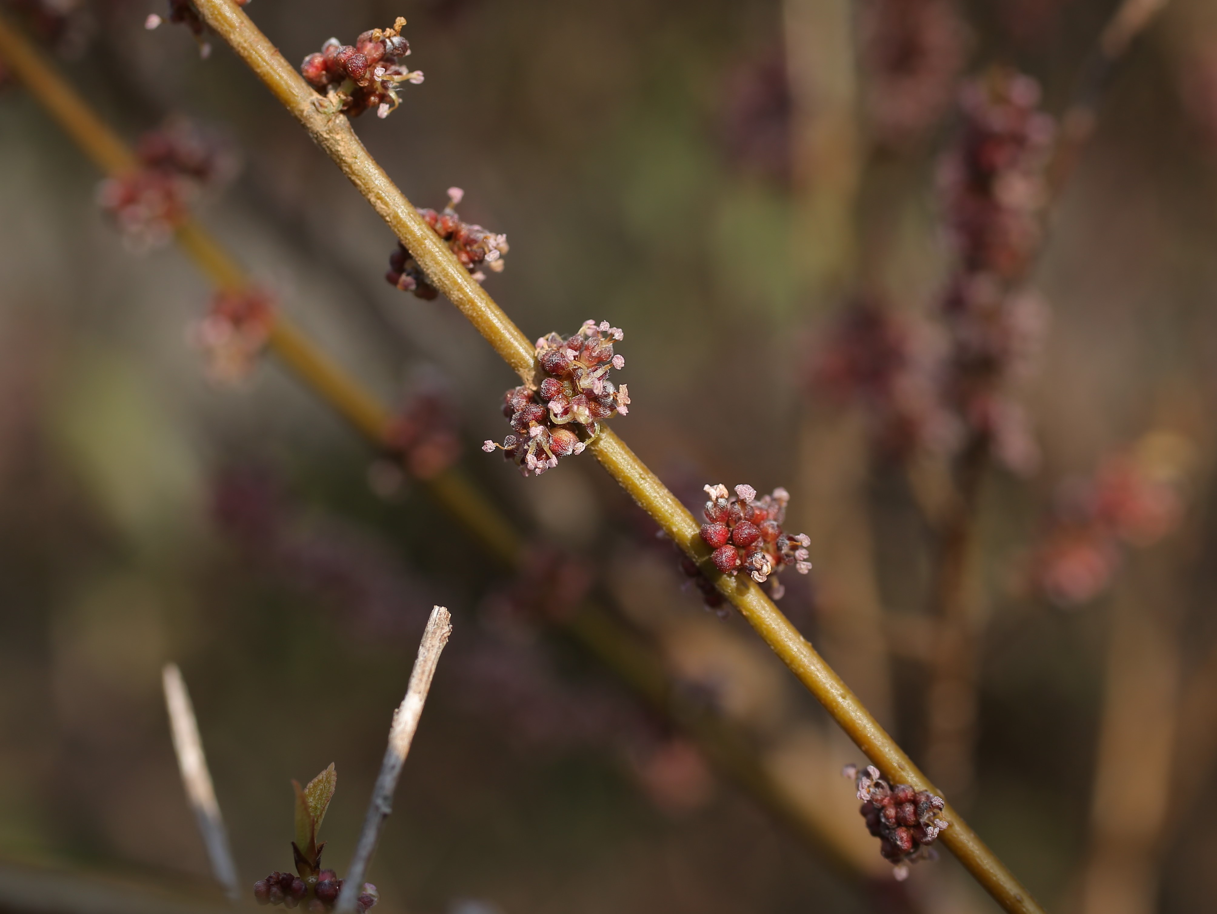 꽃 암수딴그루이며, 4-5월에 잎이 나기 전에 피거나 잎과 함께 나온다. 꽃은 2년지의 잎이 떨어진 흔적 위에 모여 달리며 꽃자루가 거의 없다. 수꽃의 화피편은 3(~4)개로 갈라지고 길이 1.2mm 정도의 난상이며 수술은 3개이다. 암꽃의 암술머리는 원반형이고 가장자리가 가늘게 갈라진다.