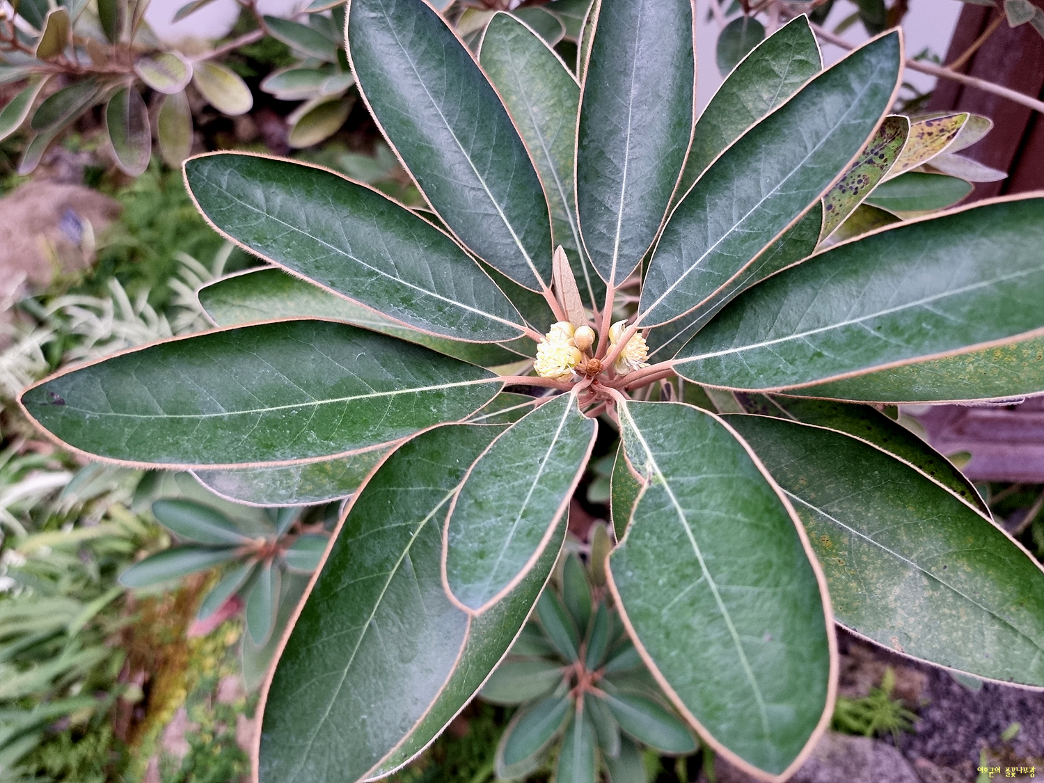 잎 어긋나며 길이 8-15cm의 장타원형이고 두꺼운 가줄질이다. 가장자리는 밋밋하고 뒤로 말린다. 잎자루는 길이 1.5-4cm이며 황갈색 털이 밀생한다.
