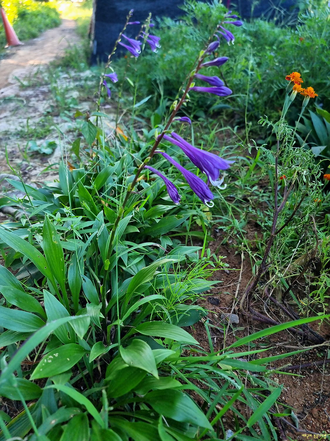 꽃 7~8월에 연한 자색으로 피고 잎 사이에서 나온 꽃줄기 끝에 이삭꽃차례로 달리며 포는 달걀모양으로 끝이 뾰족하고 길이 7~10mm이며 꽃자루는 꽃줄기와 직각을 이루고 길이는 포와 비슷하다. 꽃부리는 길이 5cm, 나비 2~2.5cm이고 끝이 갈라지며 수술은 화관과 길이가 비슷하다. 화경은 곧추서고 높이 25~75cm이며 흑자색이 돌고 중앙부에 1~2개의 포가 있다.