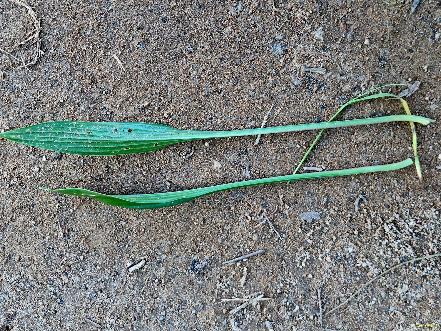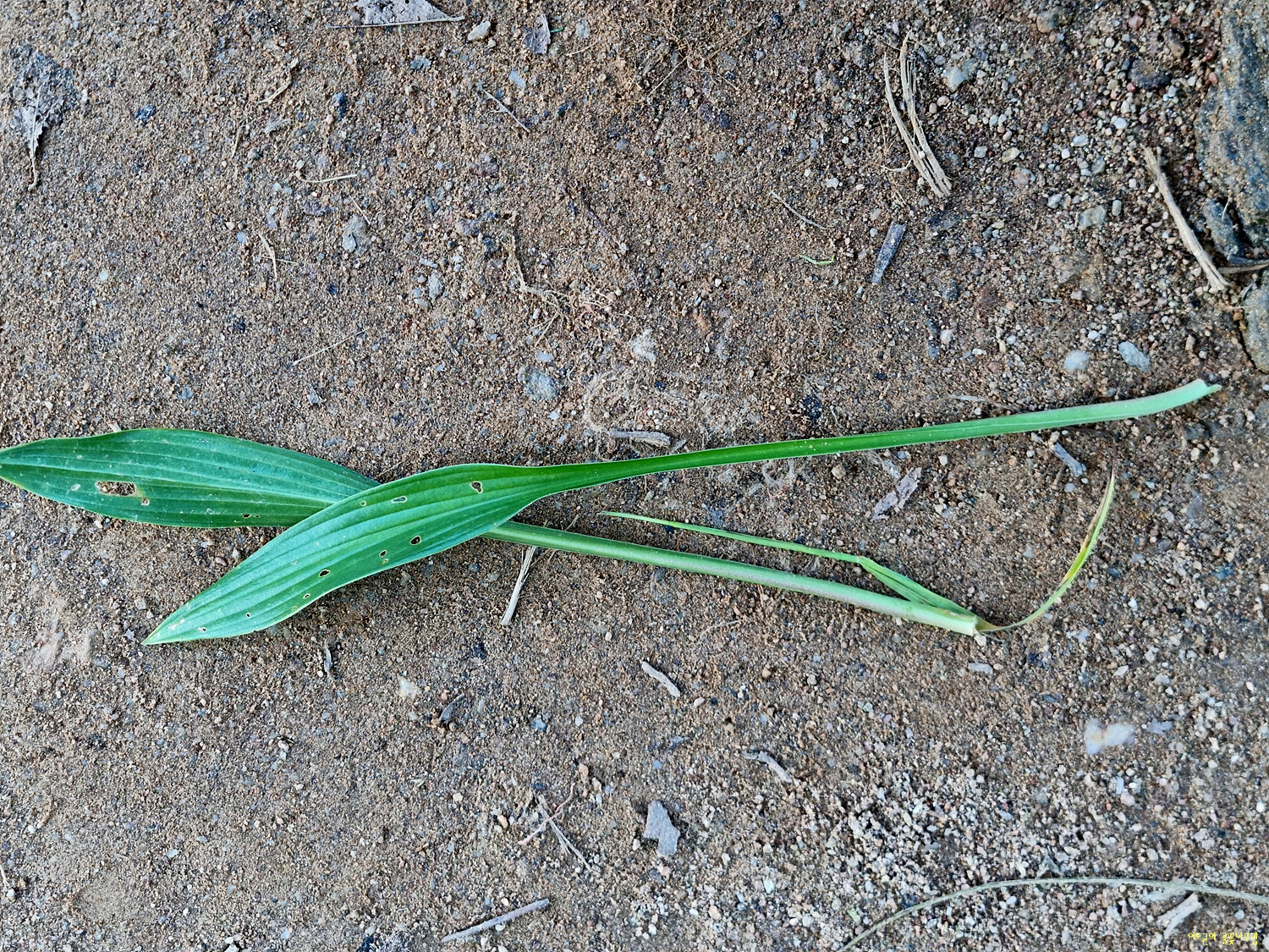 잎 뿌리에서 모여나고 난상 타원형 또는 타원형으로 길이 11.5~13.5cm, 나비 5~8cm이며 끝은 뾰족하고 밑은 둥글거나 넓은 쐐기모양이며 엽병으로 약간 흐르고 가장자리는 다소 물결 모양이며 잎맥은 양쪽에 6~7쌍이다.
