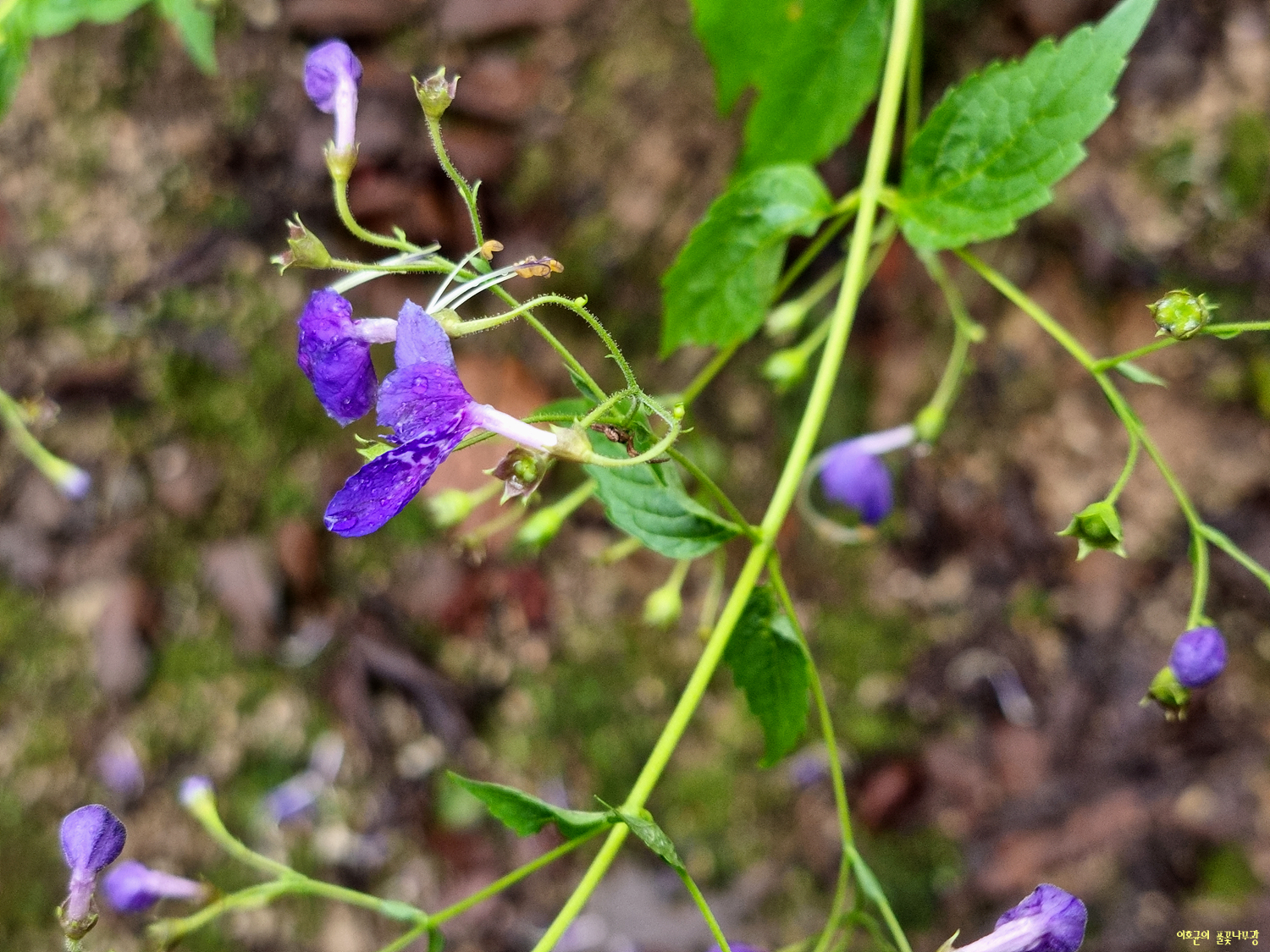 꽃 7~9월에 피는데 줄기 위쪽 잎겨드랑이에서 취산꽃차례로 드문드문 달리며, 하늘색이 도는 붉은색이다. 꽃받침은 종 모양, 5갈래로 갈라진다. 꽃부리는 아래쪽이 통 모양으로 길이 8~10mm, 위쪽은 5갈래로 깊게 갈라진 입술 모양이다. 위쪽 4갈래는 같은 색이고, 아래쪽 1갈래는 보다 크며 색이 짙고 안쪽에 흰색 무늬가 있다. 수술은 4개, 2개가 길게 꽃부리 밖으로 나와 암술대와 함께 활처럼 휘어진다. 씨방에 털이 있고, 샘털이 있거나 없다.