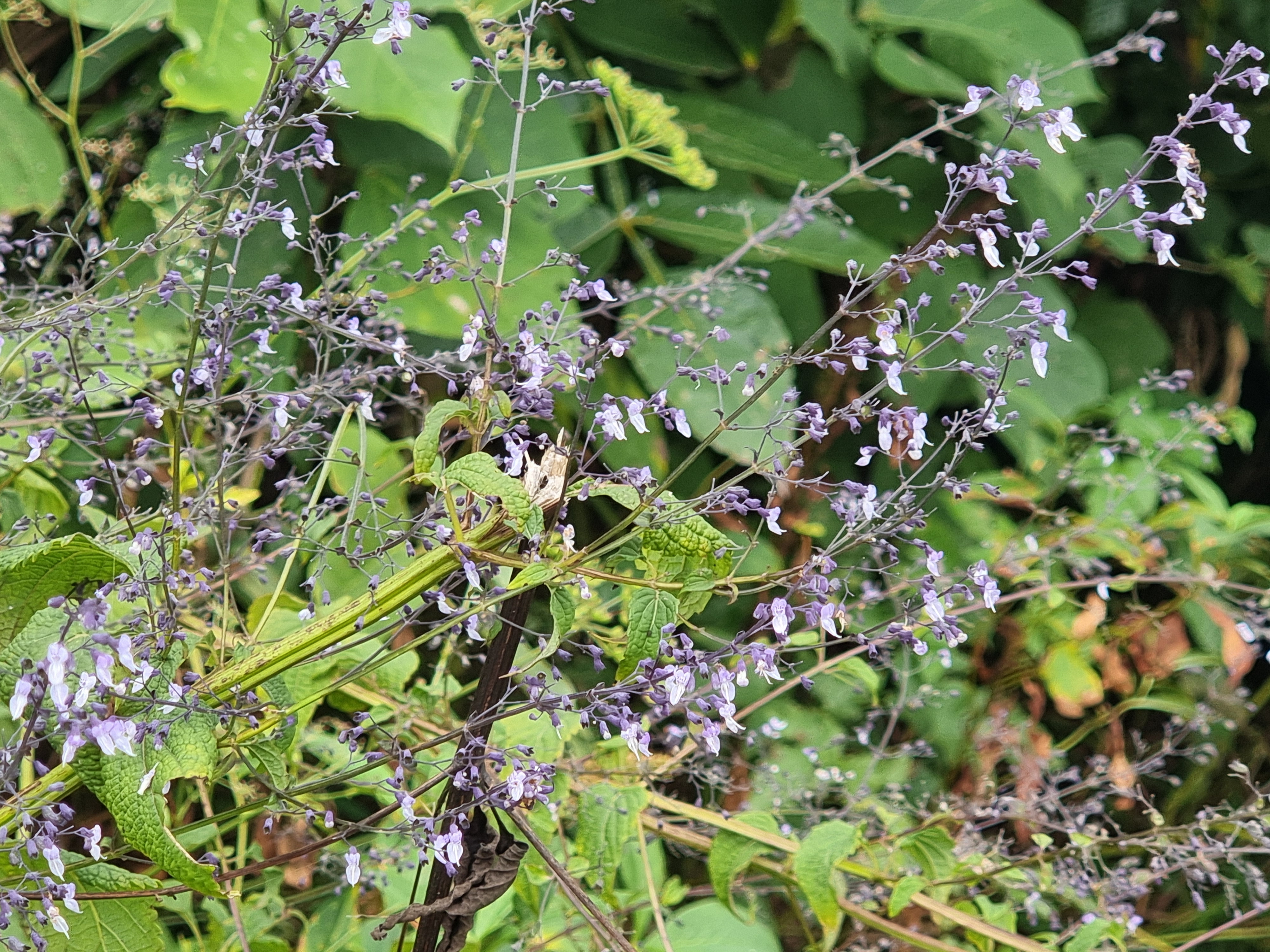 꽃 8-9월에 피고 줄기 끝과 위쪽 잎겨드랑이에서 취산꽃차례가 나서 전체가 원추꽃차례로 되며, 연한 자주색이다. 꽃받침은 5갈래, 갈래는 삼각형이다. 화관은 입술 모양, 윗입술이 4갈래로 갈라진다. 암술과 수술은 화관 밖으로 길게 나온다.