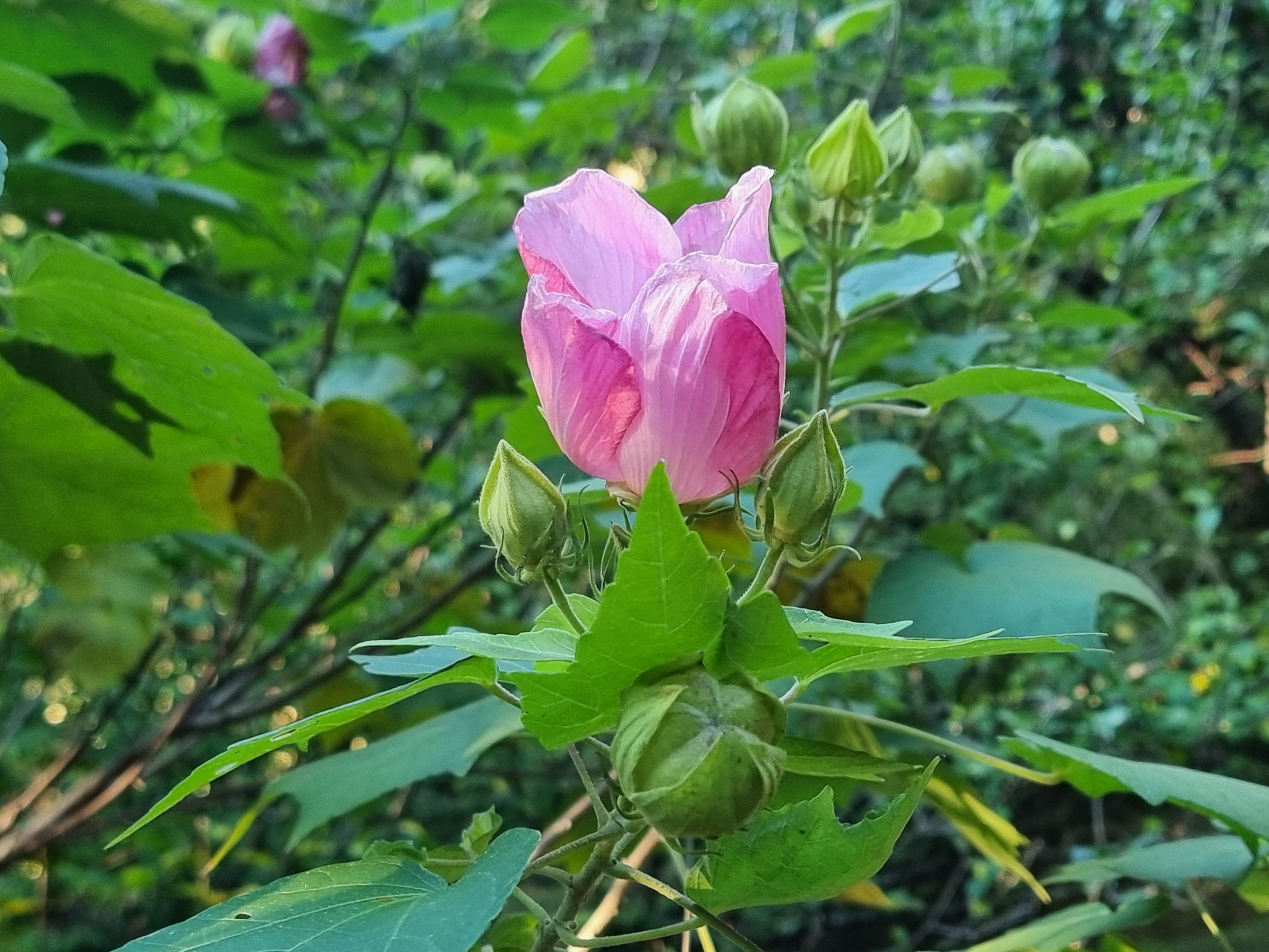 2. 낙엽 활엽 소교목, 제주도에 자생. 잎은 어긋나고 오각상 둥근 심장형, 3-7갈래로 얕게 갈라지고 밑이 심장형이며 가장자리에 둔한 톱니가 있다.------부용(H. mutabilis L.)