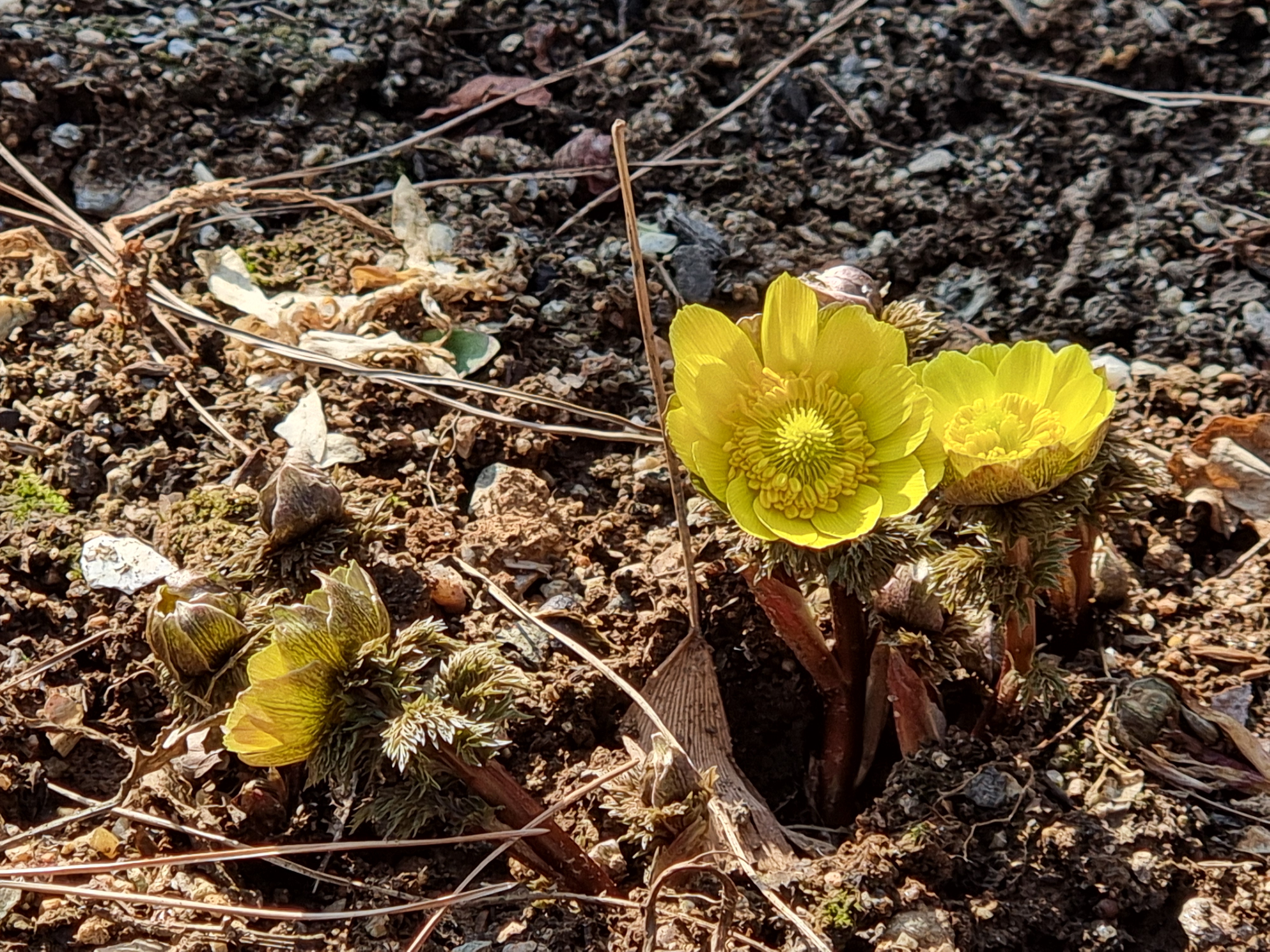 오다가 병목안 마을 도로가에 심어 놓은 복수초가 이제 막 피기 시작한다.