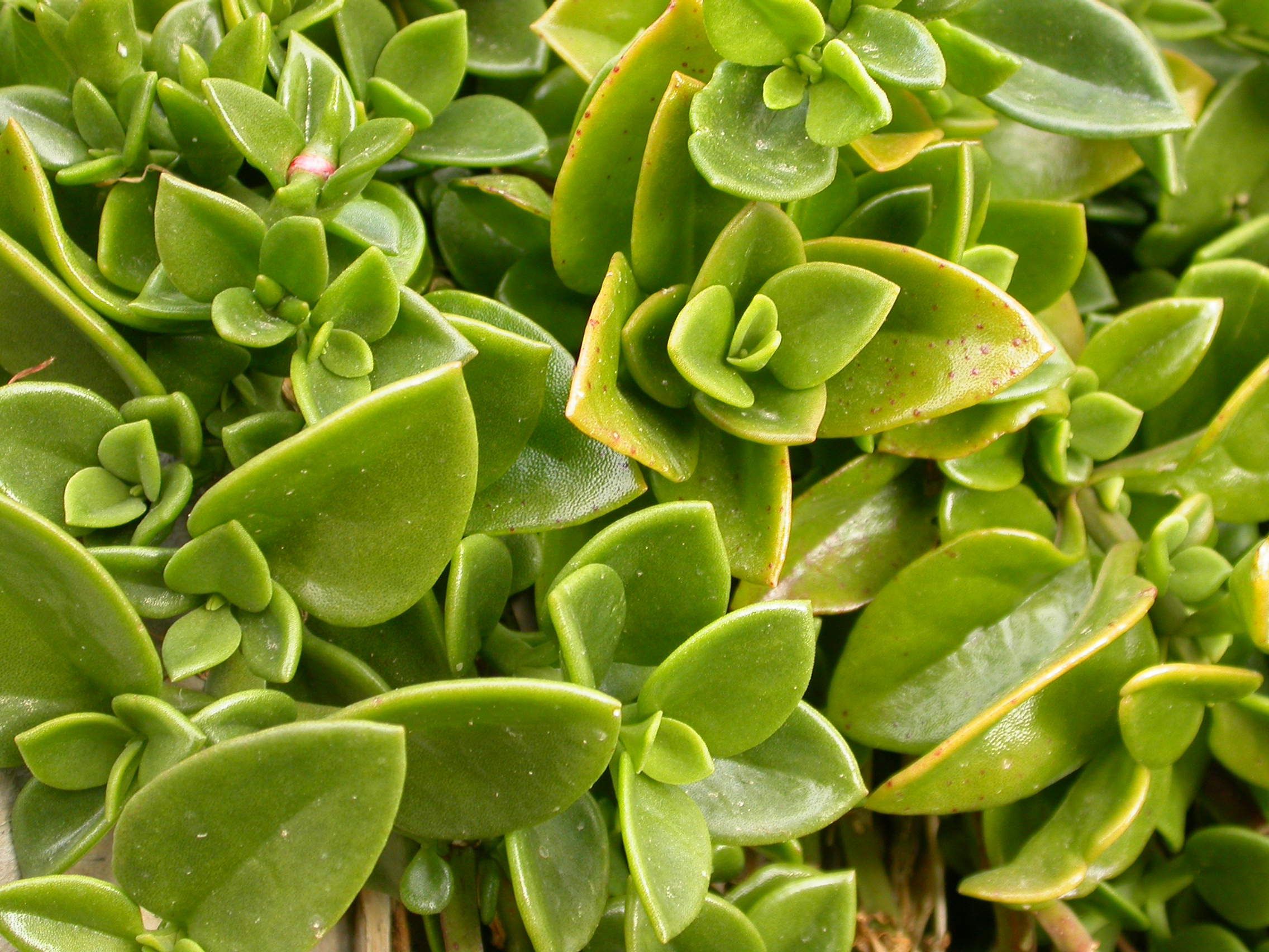 다육성, 기어가 붙는 짧은 수명의 다년생 허브로, 나무 뿌리에서 땅에 평평한 덩어리로 자라납니다. 식물은 약 10센티미터 높이에 이르지만, 전립된 줄기는 최대 약 60센티미터까지 자랍니다. 줄기는 녹색이며 줄기 둥글게 둥글게 자루를 형성합니다. 살덩이로 된 작은 잎은 마주 보고 있으며, 타원형에서 코데이트(cordate)로 되어 있고, 길이는 약 2.5센티미터이고 미세한 유두로 덮여 있습니다.