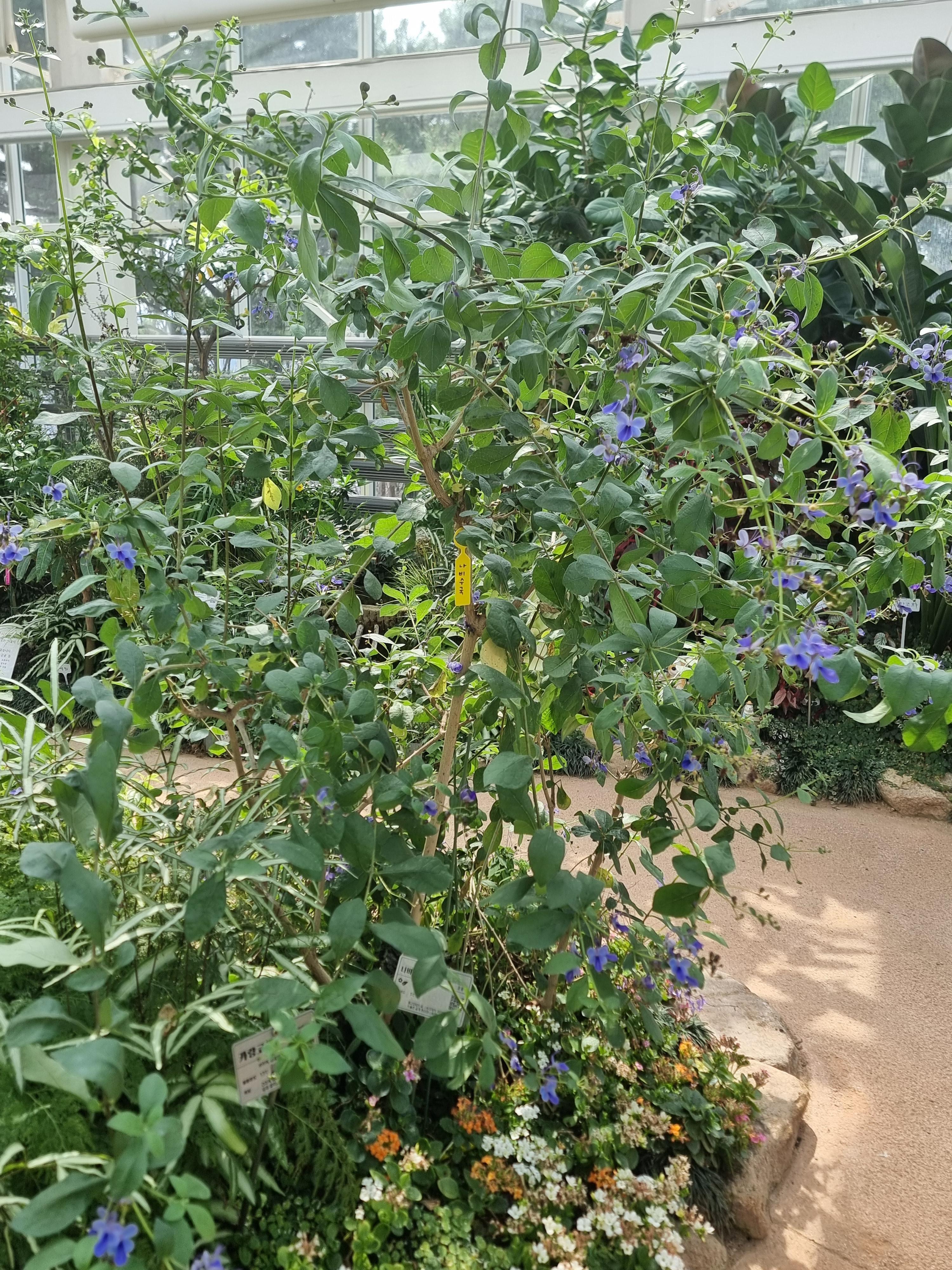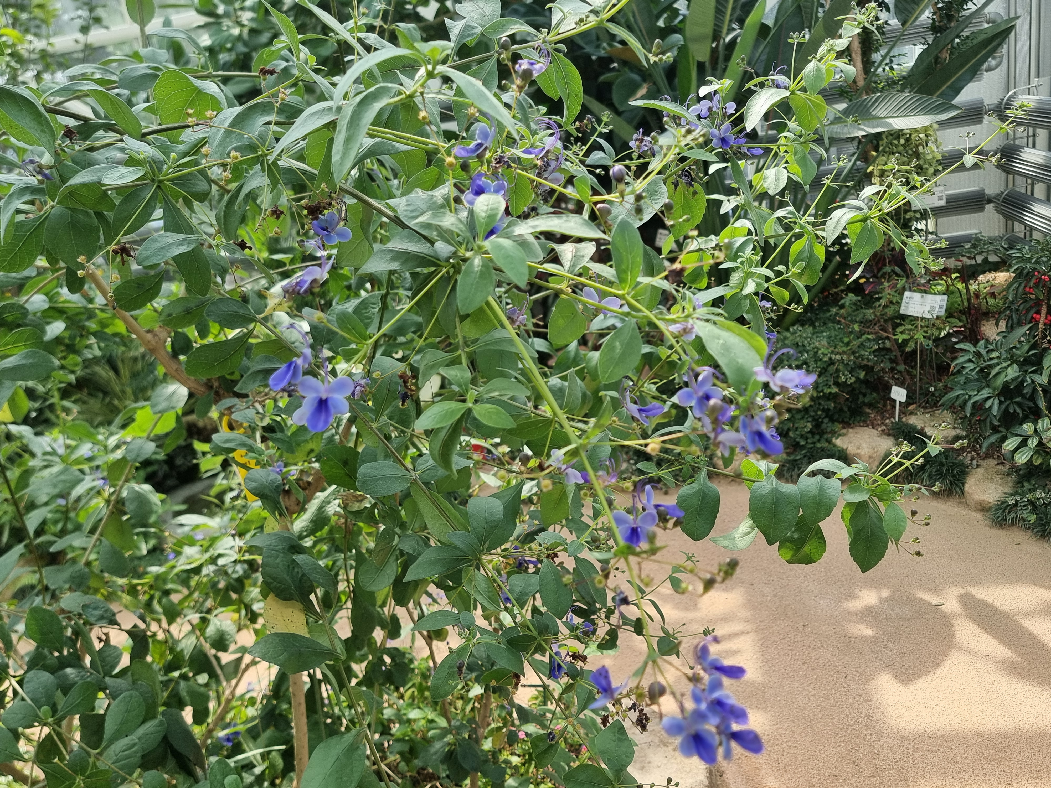 품종 '우간덴스'는 지저분한 상록 관목으로, 높이 4m, 너비 2.5m까지 자라며, 타원형 잎과 여름과 가을에 연보라색 파란 나비 같은 꽃이 무리를 피웁니다. 각 꽃은 아래쪽 꽃잎이 더 짙은 파란색입니다. 꽃은 이삭 꽃 모양으로 배열되어 있으며, 때로는 짧고 꽃다루기 모양으로 배열되기도 합니다. 수술과 꽃은 길게 뻗어 있으며 위로 휘어져 있습니다. 꽃冠은 꽃봉오리가 비대칭이며, 중간 엽은 짙은 파란색 또는 보라색 파란색이고, 측면 엽은 연한 파란색 또는 연보라색입니다. 꽃대는 꽃봉오리 모양이며 5mm 길이의 관이 있으며, 엽은 둥글고 삼각형입니다. 꽃 색깔에는 다양한 변화가 있습니다. 초록색과 파란색, 연보라색, 흰색과 파란색, 또는 파란색에서 연보라색 사이일 수 있습니다.