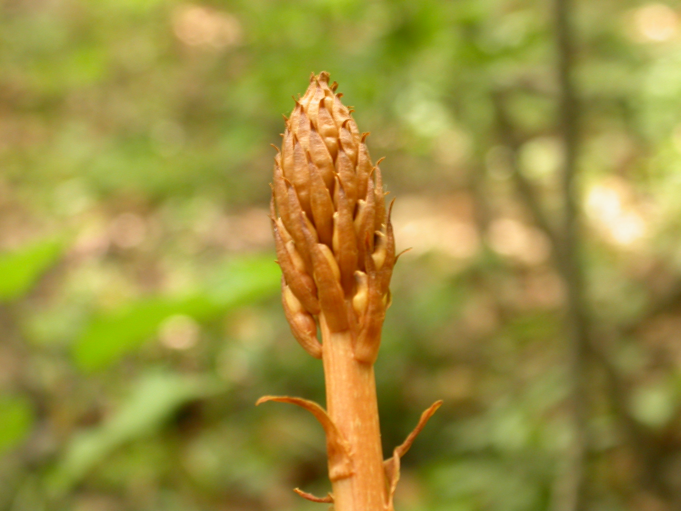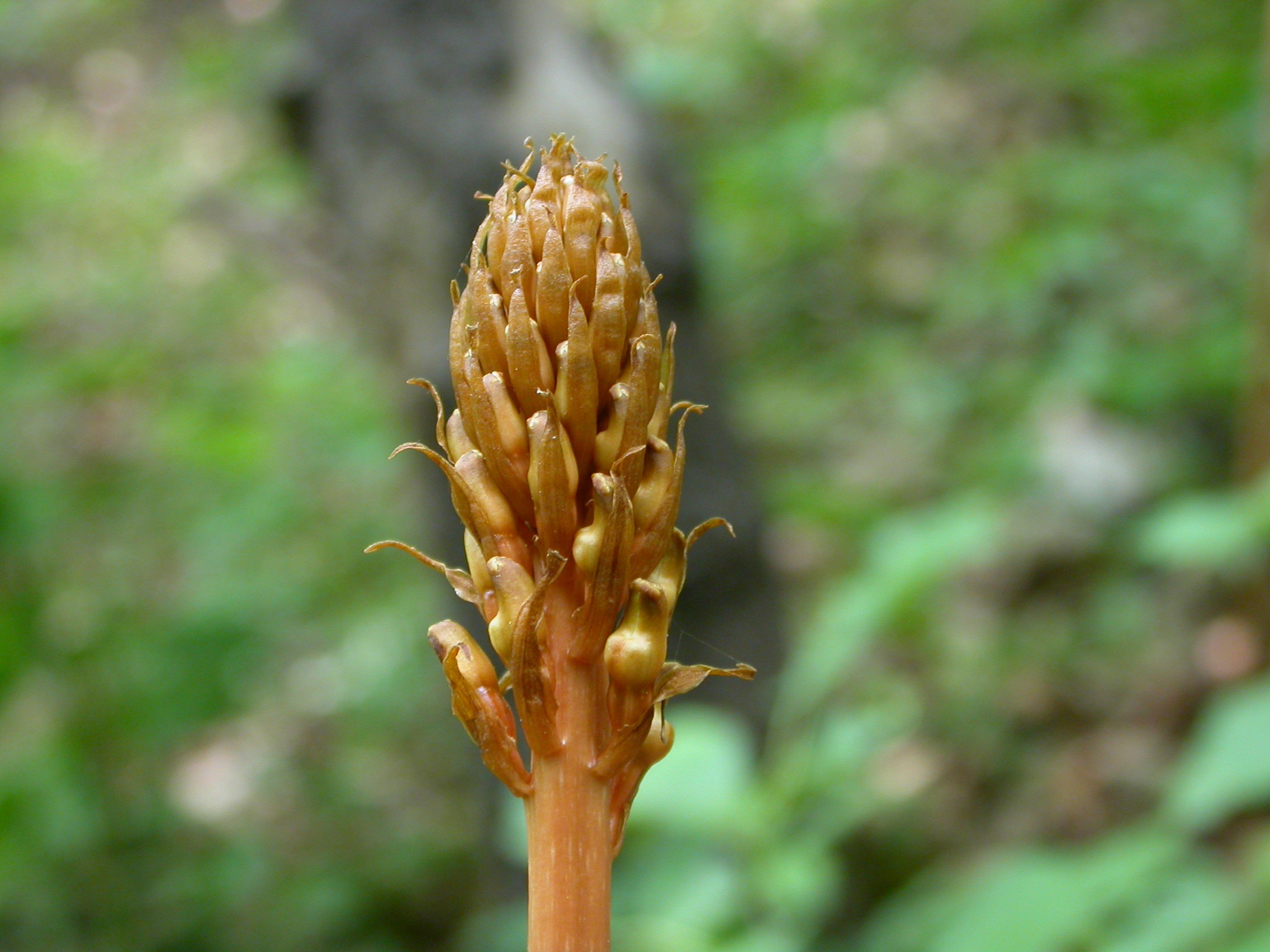 비교적 드물게 자라는 여러해살이풀로 부생란이다. 전체에 엽록소가 없다. 덩이줄기는 타원형의 감자 모양으로 길이 7~15cm, 지름 4~5cm이고 겉에 작은 비늘조각이 돌려붙는다. 줄기는 곧추서며, 원기둥 모양으로 높이 60~100cm이다. 꽃은 5~8월에 피고 연한 황색 또는 황갈색이며 정생하는 총상꽃차례는 길이 10~30cm로서 많은 꽃이 달린다. 꽃받침은 3장이 모여서 단지 모양이 되며 길이 7~8mm이다. 곁꽃잎 2장은 단지 안에 붙어 있고 입술꽃잎은 깊숙이 들어가 있어 잘 보이지 않는다. 열매는 삭과로 타원형이다. 한방에서 뿌리를 중풍이나 불면증 등의 여러 가지 증상에 귀한 약재로 사용한다.